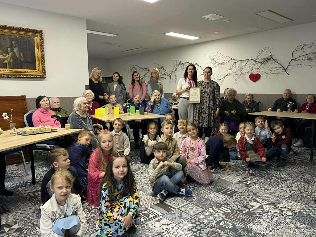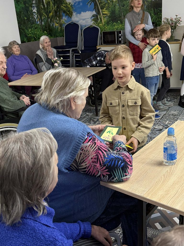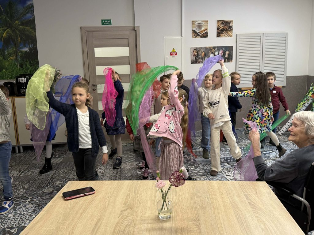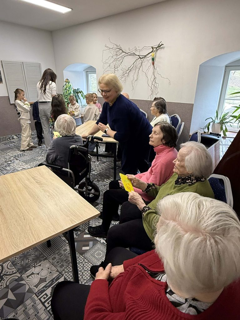Mažieji su džiaugsmu dainavo, šoko, deklamavo eilėraščius, dovanojo savo rankų darbo atvirukus bei gardžius keksiukus. Šis susitikimas buvo kupinas jautrių akimirkų – vaikų nuoširdumas ir dėmesys sušildė senjorų širdis ![]()