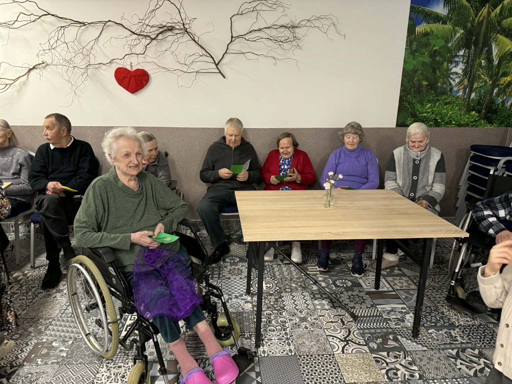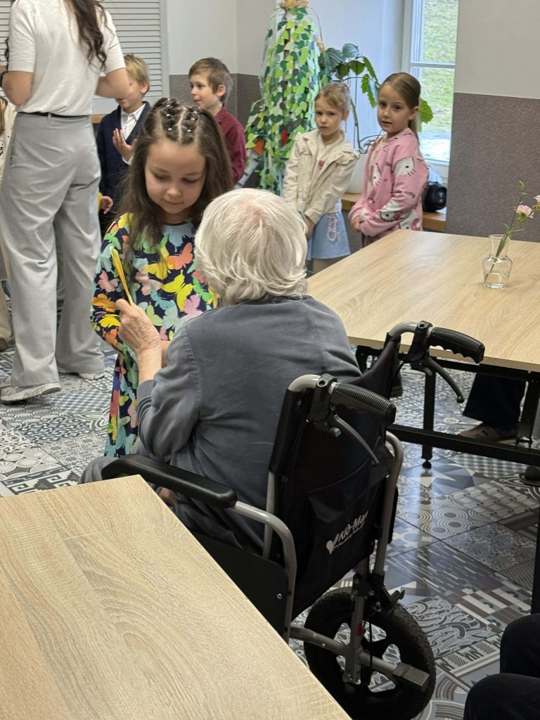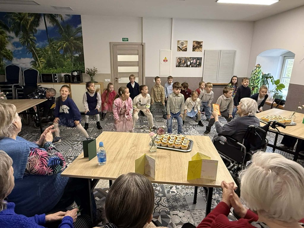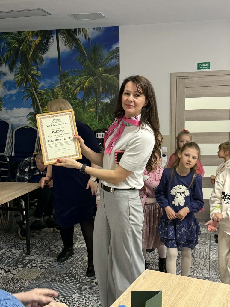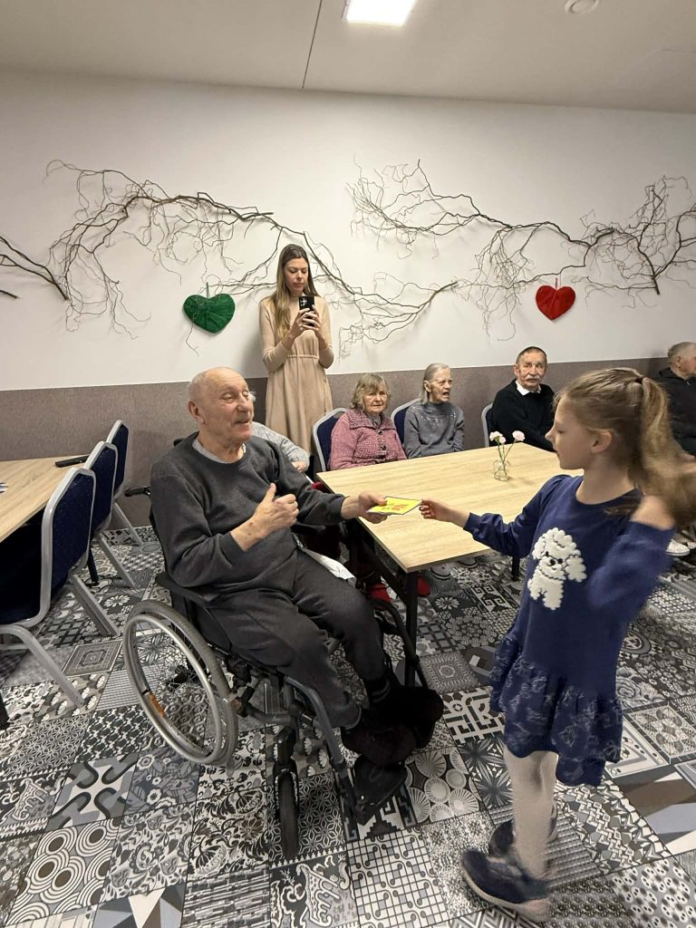 Mažieji su džiaugsmu dainavo, šoko, deklamavo eilėraščius, dovanojo savo rankų darbo atvirukus bei gardžius keksiukus. Šis susitikimas buvo kupinas jautrių akimirkų – vaikų nuoširdumas ir dėmesys sušildė senjorų širdis ![]()